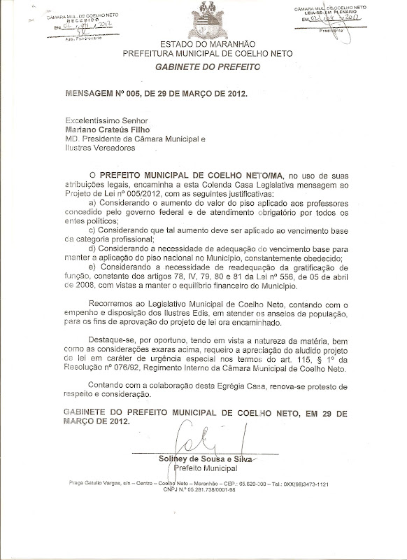 Projeto de Lei encaminhado pelo Prefeito Soliney Silva implanta o Piso Salarial aos professores de Coelho Neto